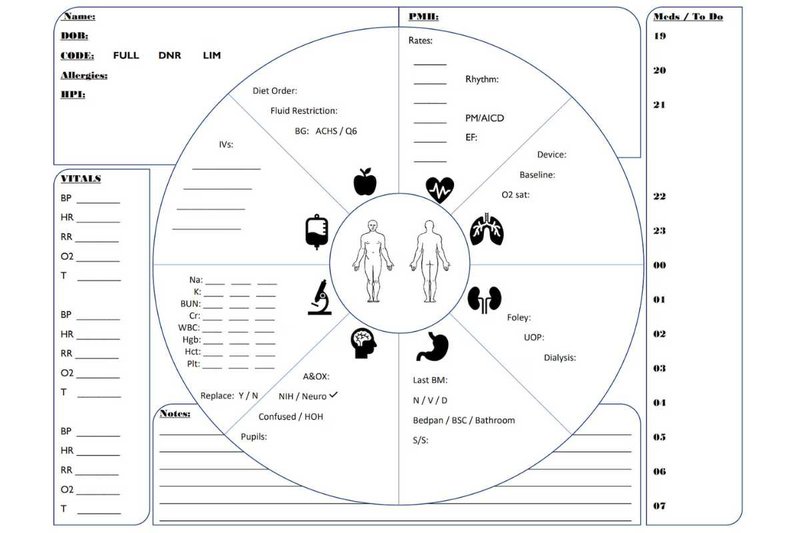 - To-do list: A checklist or space for nurses to list tasks and responsibilities for the shift.